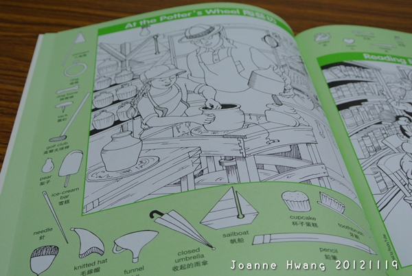 Hidden Pictures裡頭內頁有單頁的、也有跨兩頁的,每頁的圖旁邊都有一些指定的物品,讓小朋友們在大圖中找出來,給小朋友玩之前,Joanne會要小朋友先念旁邊的單字給我聽,用拼音的方式也好、唸錯也沒關係,稍微糾正一下就好,保持小朋友對英文的興致最重要,玩了幾次之後,很多英文單字就自然而然的會唸了呢。