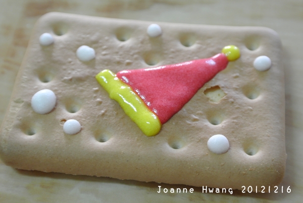 一旁的老爸說:你怎麼那麼笨,不會不要寫英文字,改畫一頂聖誕帽不就好了嗎?真是一語驚醒夢中人!試驗的結果,也別有一番風味呢!