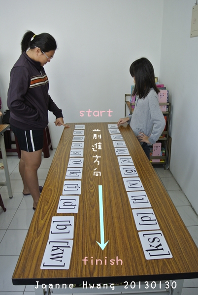 兩個人必須大聲唸出所指到的的子音音標,一邊念、一邊前進,因為大聲唸,所以老師可以隨時盯著看念得對不對。