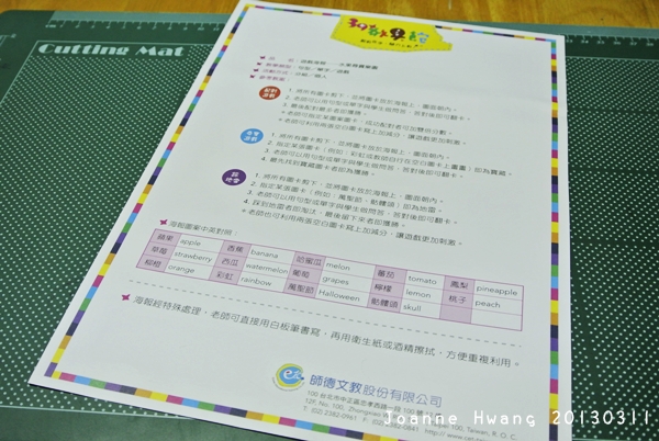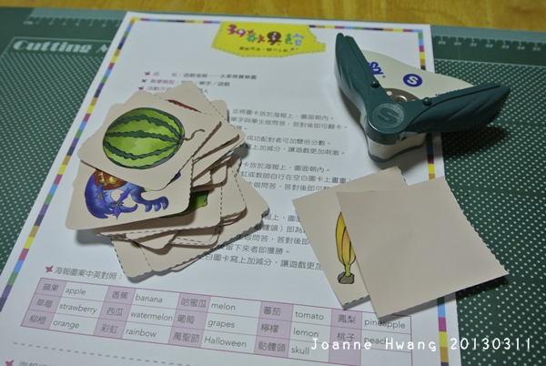 Joanne把遊戲小卡裁下來,雖然小卡護貝後會比較耐用,但是護貝後就不能用白板筆書寫,Joanne想保留可用白板筆書寫的這項功能,所以就沒護貝了。