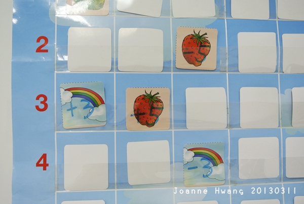 水果小卡因為可以用白板筆書寫,所以可以事先在小卡上寫上加減分,Joanne打算同一種水果上寫相反分數,如上圖草莓卡,一張草莓卡寫+5,一張草莓卡寫-5。